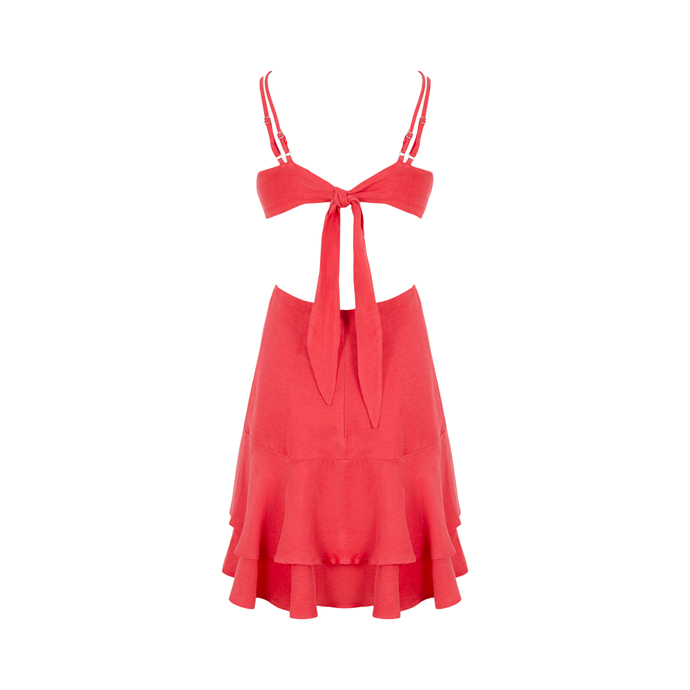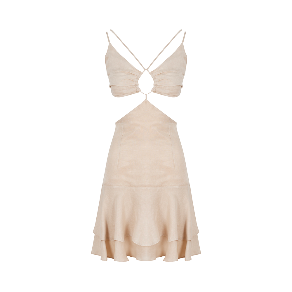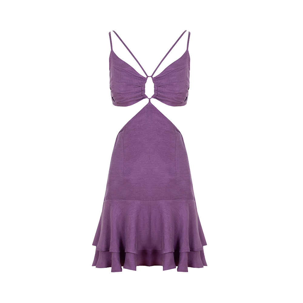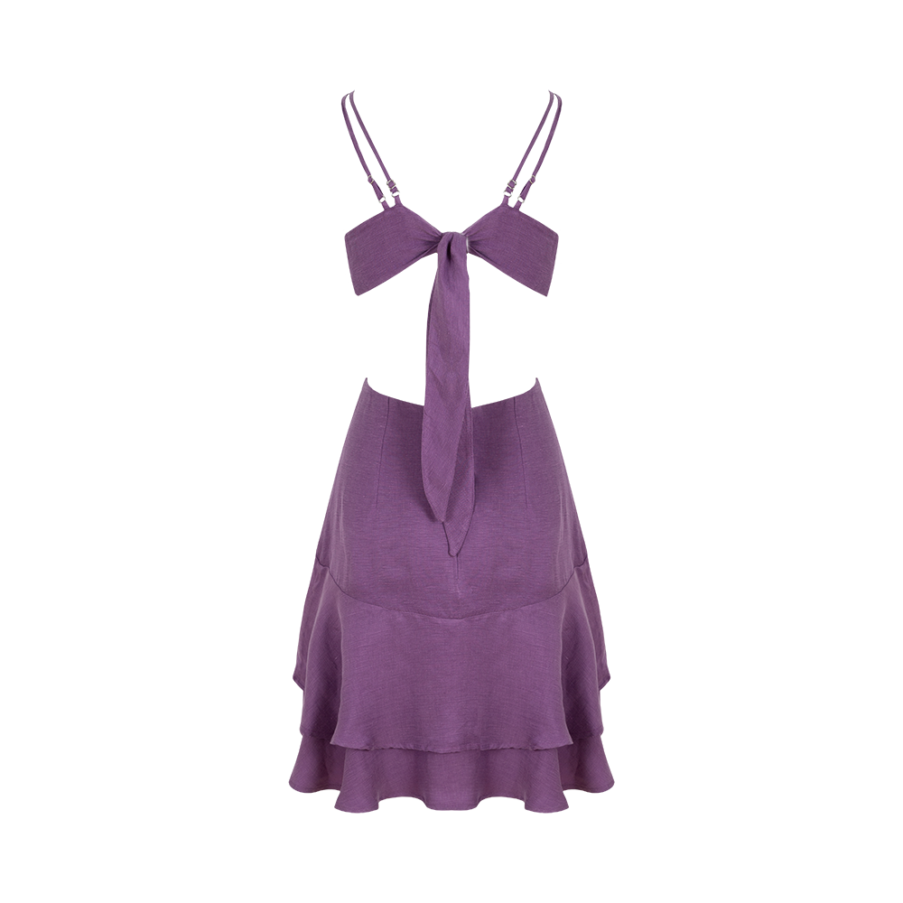 Zarif ve modern tarzıyla dikkat çeken mor, pembe ve bej renkteki elbise, doğal ve sürdürülebilir vegan ipek keten kumaştan üretilmiştir. Çift askılı detayıyla zarif bir dokunuş sunarken, sırt kısımındaki fiyonk ile fırfır detayları modeli tamamlamaktadır. Göğüs detayları ise dikkat çekici bir görünüm oluşturur. Bu elbise, özel davetlerden gece şıklığına kadar mezuniyet baloları için mükemmel bir tercihtir. Yüksek topuklu sandaletler ve minimalist aksesuarlarla tamamlayarak sofistike bir görünüm elde edebilirsiniz.
