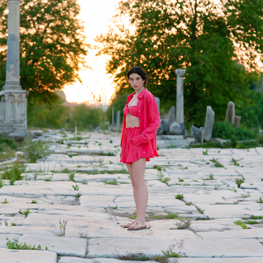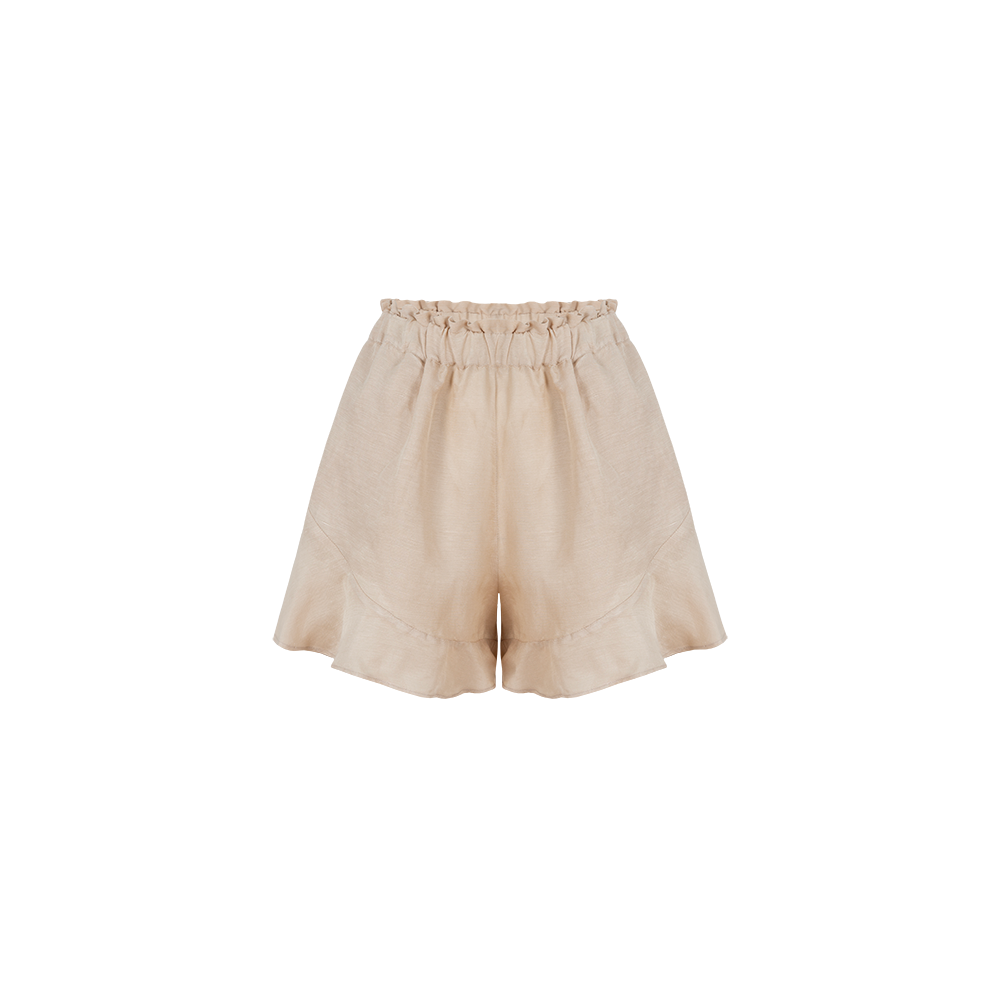 Vegan ipek keten kumaştan yapılmış beli fırfır detaylı kalın fırfırlı şort, rahat ve şık bir görünüm sunar. Hem günlük giyimde hem de özel etkinliklerde kullanabileceğiniz çok yönlü bir parçadır. Üst olarak salaş bir bluz, şık bir gömlek veya Fiolas’ın büstiyerlerini tercih edebilirsiniz. Şık topuklu ayakkabılar veya sandaletlerle tamamlanarak tarzınızı vurgulayabilirsiniz.